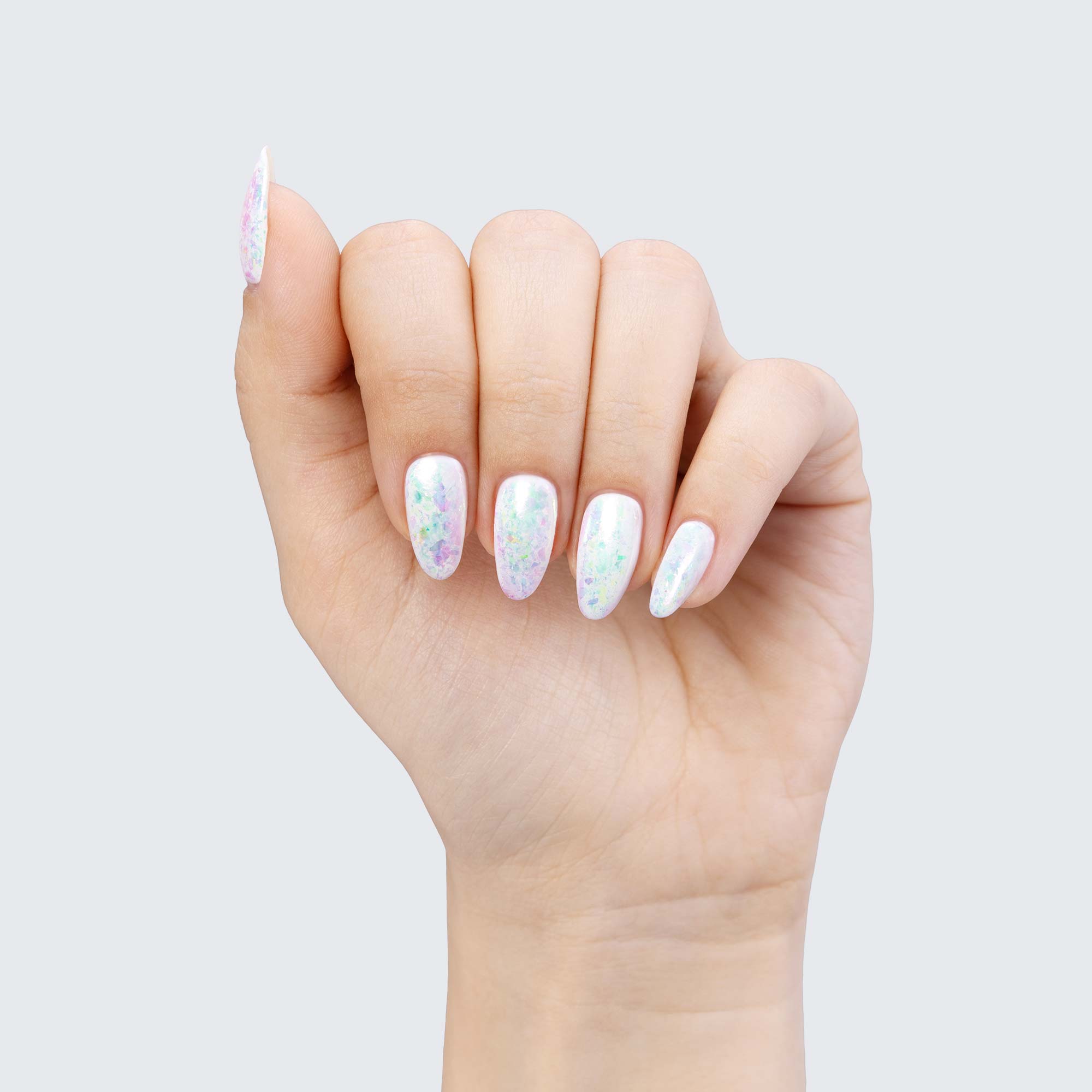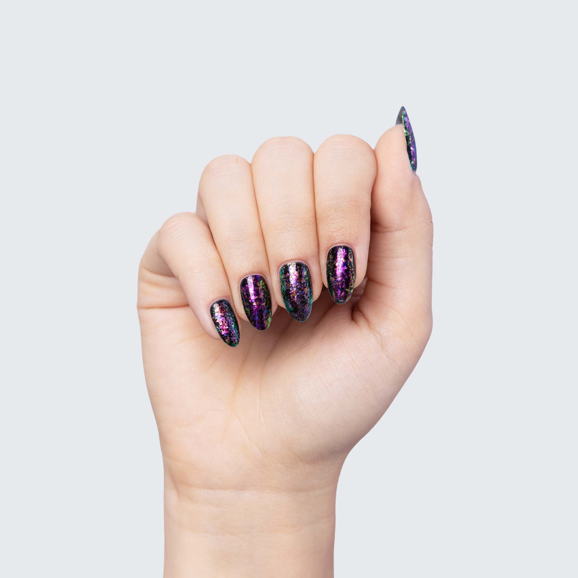 The ethereal allure of PRECIOUS FLAKES makes them a marvelous choice for manicures whose beauty can outreach any stretch of imagination. Because they are semi-translucent, each individual colour scheme takes on surprisingly varied hues depending on which gel polish you use as a base.